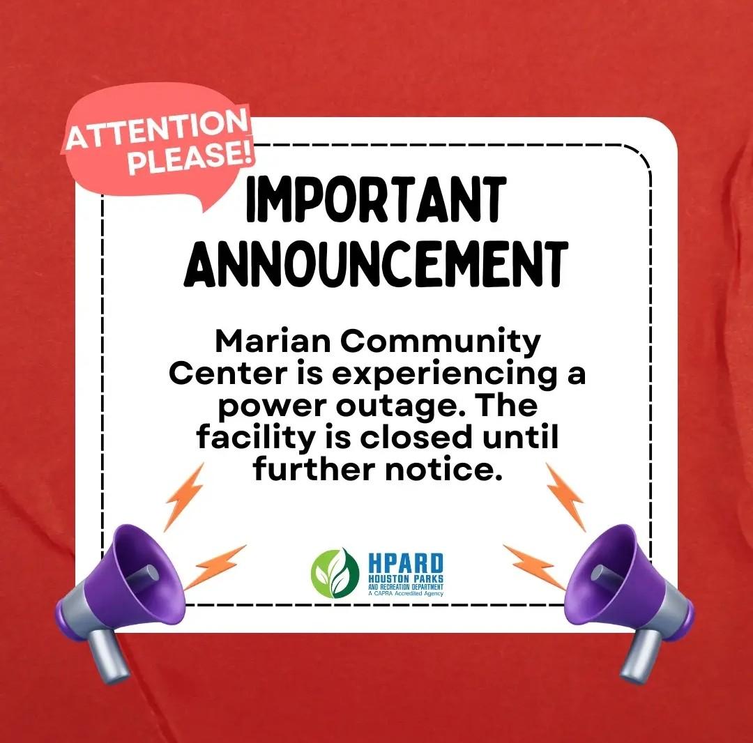 | We want to share an important update from the Houston Parks and Recreation Department (HPARD) regarding the temporary closure of the Marian Park Community Center. Unfortunately, the center recently experienced a power outage caused by a snake coming into contact with the facility’s power bus. This resulted in a complete loss of power. The equipment needed to restore power is highly specialized and must be custom manufactured, so at this time, we do not have a confirmed timeline for reopening. HPARD is actively exploring temporary solutions, including repair options and cost estimates. Once quotes are received, staff will work to identify potential funding sources, as this unplanned repair was not included in the current budget. In the meantime, HPARD’s Recreation Division is working to relocate programs and activities to nearby community centers. If you usually attend programs at Marian Park, you’re encouraged to visit one of the following locations: Lansdale Community Center
