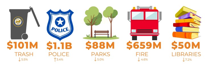 | On Tuesday, May 6, 2025, Mayor Whitmire released the proposed $7 billion City of Houston Fiscal Year (FY) 2026 operating budget. The total budget represents a 2.3% increase over last year’s spending. The General Fund (tax-supported) budget is $3.03 billion. The General Fund budget has decreased by 2.4%, or $74.5 million. This decrease is due to many factors, notably the fact that 1,059 city employees took advantage of the incentive program offered to those eligible to retire, the Voluntary Municipal Employee Retirement Payment Option. Over 35% of those who were offered the incentive package decided to retire, saving more than $99 million on an annual basis across all funds, $29 million in the General Fund. Further savings are attributable to city government restructuring, consolidations, management efficiencies, and implementing other recommendations from the Ernst & Young Citywide Efficiency Study. This budget funds the first year of a new police contract, pending council approval, bringing compensation levels in line with other major Texas cities. It also funds the second year of the contract with Houston firefighters. Public safety spending is $1.8 billion, 60% of General Fund spending. The budget includes funding for five police cadet classes and nine fire cadet classes. The proposed budget funds the municipal employee contract approved last year. It does not include an increase in taxes or a trash fee. In April, Mayor Whitmire successfully negotiated an agreement with drainage lawsuit plaintiffs which outlines how the city will meet its commitment to increase annual street and drainage project spending to levels approved by voters – an extra $100 million annually. The settlement will allow for a phased-in spending increase for these improvements; an increase of $16 million is included in this budget. Below are the proposed FY 2026 budgets for some key General Fund departments. Arrows indicate the percentage change from FY 2025 spending. |