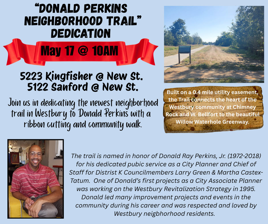 | We’re excited to invite you to the ribbon cutting and community walk celebrating the newest neighborhood trail in Westbury—The Donald Perkins Trail. This new 0.4-mile trail, built along a utility easement, connects the heart of the Westbury community at Chimney Rock and W. Bellfort to the scenic Willow Waterhole Greenway. It’s a beautiful addition to our neighborhood and a meaningful tribute to someone who gave so much to our city. The trail is named in honor of Donald Ray Perkins, Jr. (1972–2018), a dedicated public servant who served as a City Planner and Chief of Staff for District K Council Members Larry Green and Martha Castex-Tatum. One of Donald’s earliest projects was the Westbury Revitalization Strategy in 1995, and his passion for community development never wavered. Throughout his career, Donald helped lead numerous improvement projects and community events. He was deeply respected and loved by Westbury residents, and this trail stands as a lasting reflection of his commitment and legacy. We hope you’ll join us as we walk in memory of Donald and celebrate this special addition to our community. |