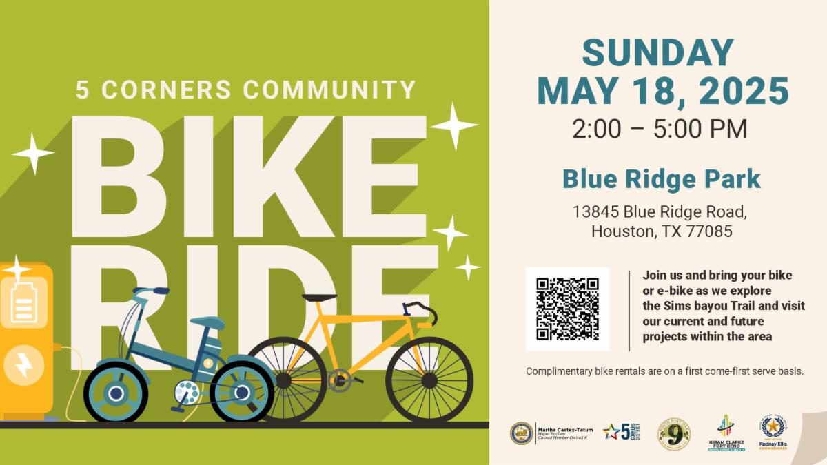 | Get ready to roll, District K! You’re invited to join us for the 5 Corners Community Bike Ride on Sunday, May 18, from 2–5 PM at Blue Ridge Park for an afternoon of fun, fitness, and community connection. This isn’t just a bike ride—it’s a chance to explore the scenic Sims Bayou Trail, discover hidden gems in the neighborhood, and get a first-hand look at exciting projects happening now and in the future throughout the 5 Corners area. Don’t have a bike? No worries! We’ve got you covered with complimentary bike and e-bike rentals, available on a first-come, first-served basis. Just bring your energy and curiosity—and maybe a friend or two! 🎟️ Reserve your spot here: Eventbrite – 5 Corners Community Bike Ride Let’s ride together and see how we’re building a better, more connected community—one mile at a time! |