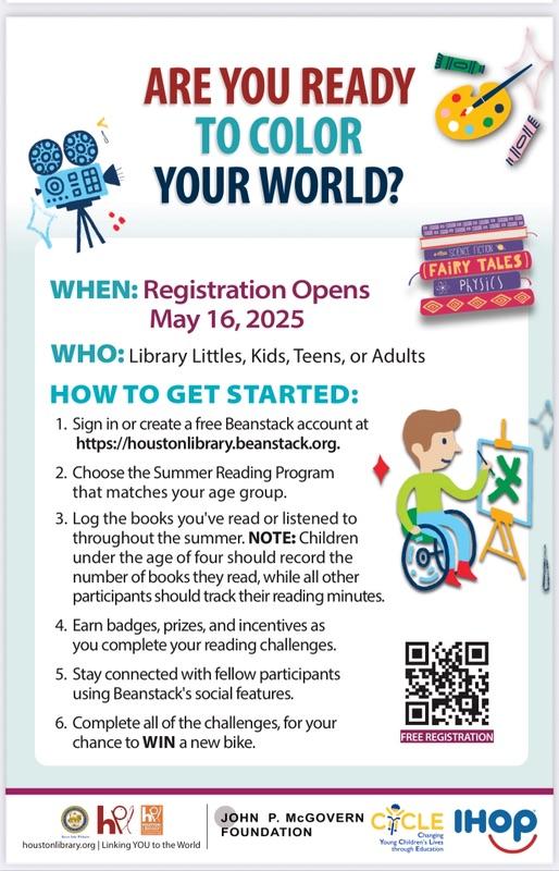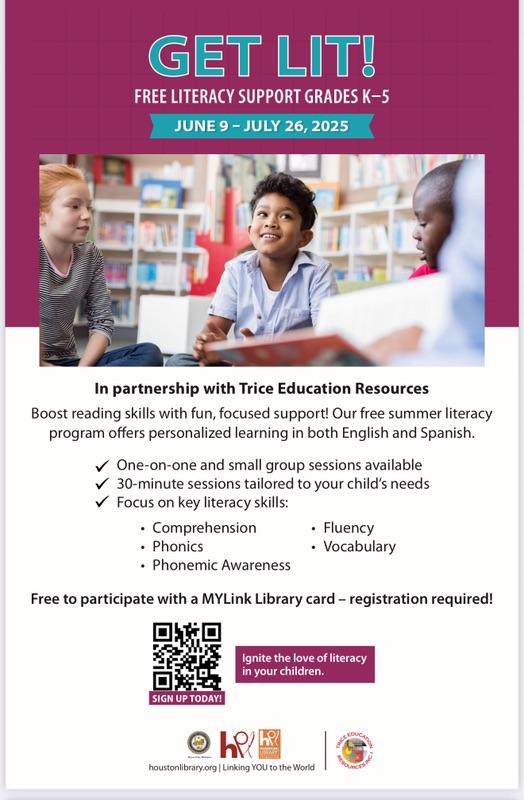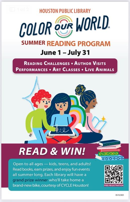 | The Houston Public Library has something for everyone this summer—check out what’s happening in District K! Color Our World: Summer Reading Program June 1 – July 31 Whether you’re a Library Little, Kid, Teen, or Adult, there’s a fun way to track your reading and win prizes this summer! Dive into new books, explore your imagination, and log your progress online. 📲 Scan the QR code on the flyer to get started! Get Lit! Free Literacy Support June 9 – July 25 Need a reading boost? The Get Lit! program offers free literacy support for Grades K–5 at four locations, including Vinson Neighborhood Library right here in District K. Let’s keep young minds engaged and growing all summer long! For full details and schedules, visit houstonlibrary.org. #DistrictKReads #HPLSummer #ColorOurWorld #GetLitHPL #SummerLearning #HoustonPublicLibrary |