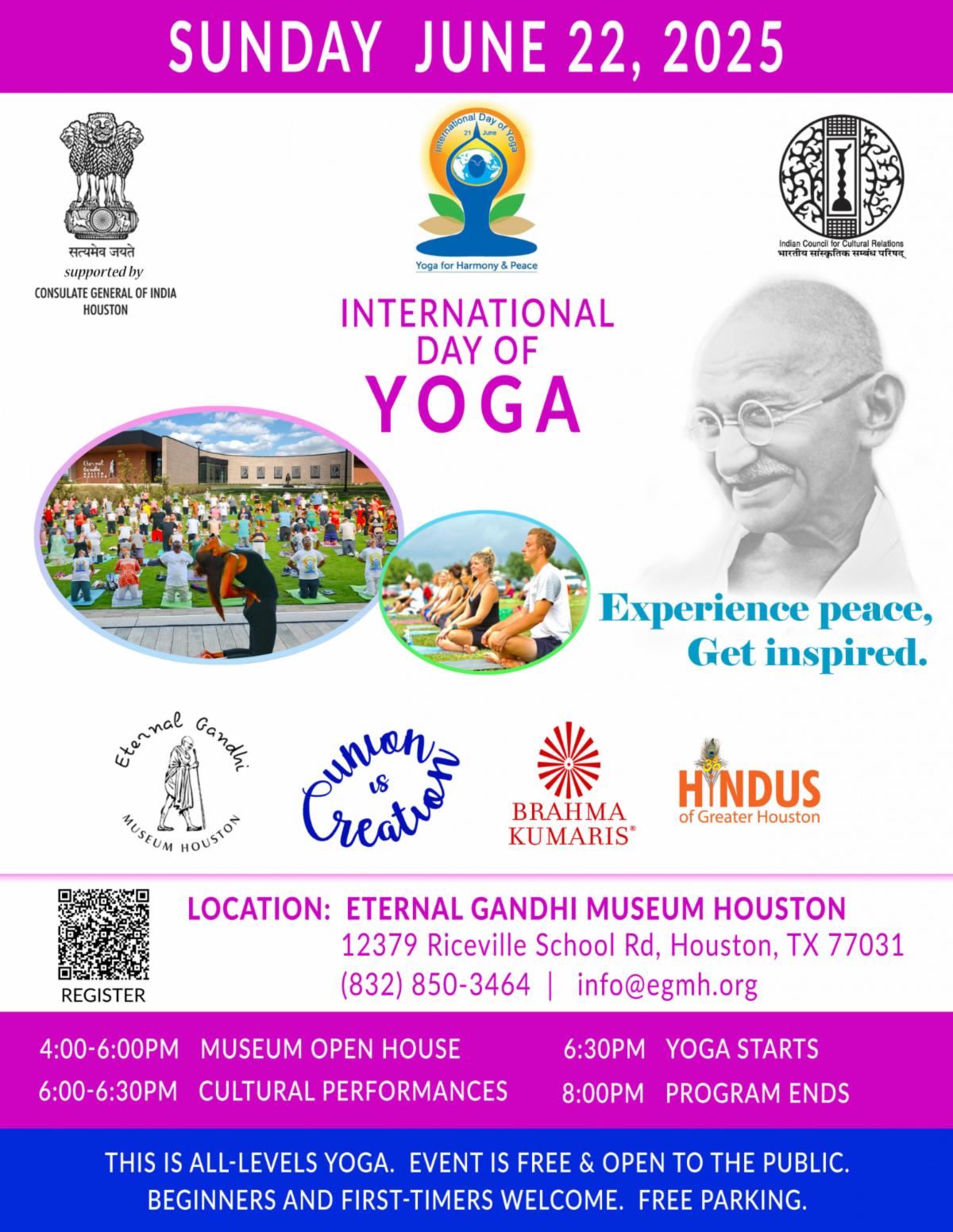 | 🧘🏾♀️ Experience Peace. Get Inspired. Join us for a free, family-friendly evening of mindfulness and movement on Sunday, June 22, 2025, at the beautiful Eternal Gandhi Museum Houston (12379 Riceville School Rd.). ✨ Schedule of Events: - 4:00 – 6:00 PM – Museum Open House
