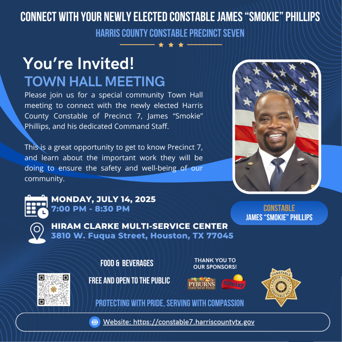 | Come out and meet your newly elected Harris County Precinct 7 Constable James “Smokie” Phillips and his command staff at a special community town hall meeting! 🗓 Monday, July 14, 2025