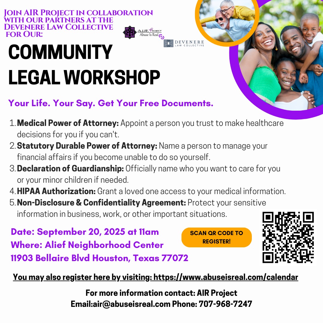 | The A.I.R. Project (Abuse Is Real) is partnering with the Devenere Law Collective to bring you a FREE in-person legal workshop designed to help families and individuals secure essential legal documents before a crisis happens. This workshop is a great opportunity for Houstonians—especially underserved community members to get critical resources at no cost, including: - Medical Power of Attorney