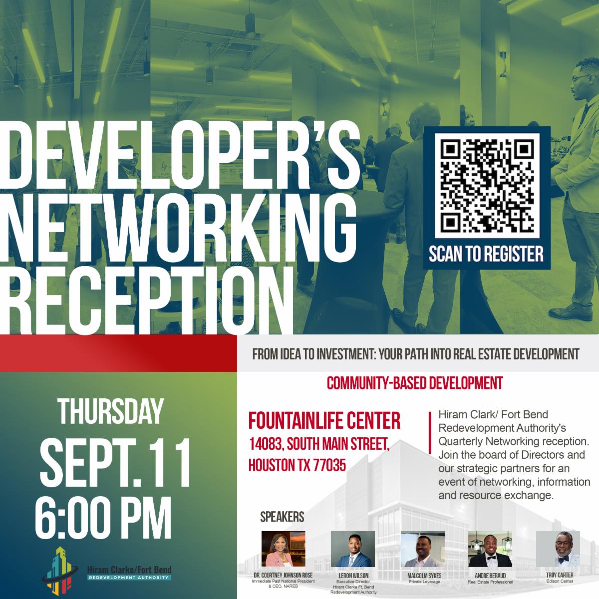 | Are you interested in real estate development or looking to connect with leaders in the industry? Join the Hiram Clarke/Fort Bend Redevelopment Authority’s Quarterly Networking Reception for an evening of networking, learning, and resource-sharing. 📅 Thursday, September 11