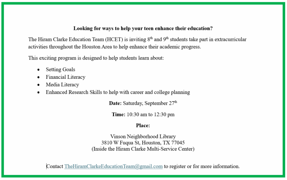 The Hiram Clarke Education Team (HCET) is hosting a special program designed to give 8th and 9th graders the tools they need to thrive academically and plan for their futures! Students will explore:- 🎯 Goal Setting