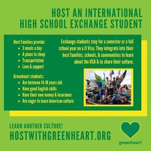 | High schools in District K and surrounding areas will welcome international exchange students through Greenheart Exchange. These students, from over 60 countries, will live with local families, attend school here, and share their unique cultures while learning about life in the U.S. Hosting is a special way for families to experience another culture firsthand, gain a fresh perspective, and build lifelong friendships—without leaving home! Greenheart also offers: - Reciprocal School-to-School Exchange Programs