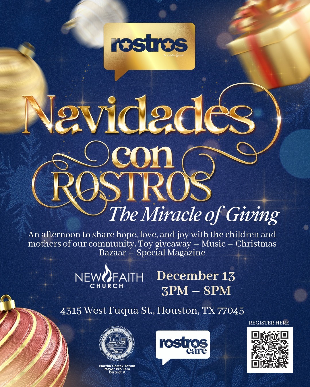 | You’re invited to “The Miracle of Giving,” a beautiful afternoon dedicated to hope, love, and lifting up families in our community. District K is honored to partner with New Faith Church and Rostros Magazine for this special celebration on Friday, December 13, from 3 PM to 8 PM at 4315 West Fuqua St. This magical event will include a toy giveaway, music, a Christmas bazaar, and festive activities for children, plus a special highlight: A cover reveal with Mayor Pro Tem Martha Castex-Tatum, celebrating stories that uplift and inspire. If your family would like to attend, please register here: https://qqxki.share.hsforms.com/2Yc7BfXjXQPSzSlbhKWgD2g We look forward to sharing a day filled with joy, generosity, and community spirit. |